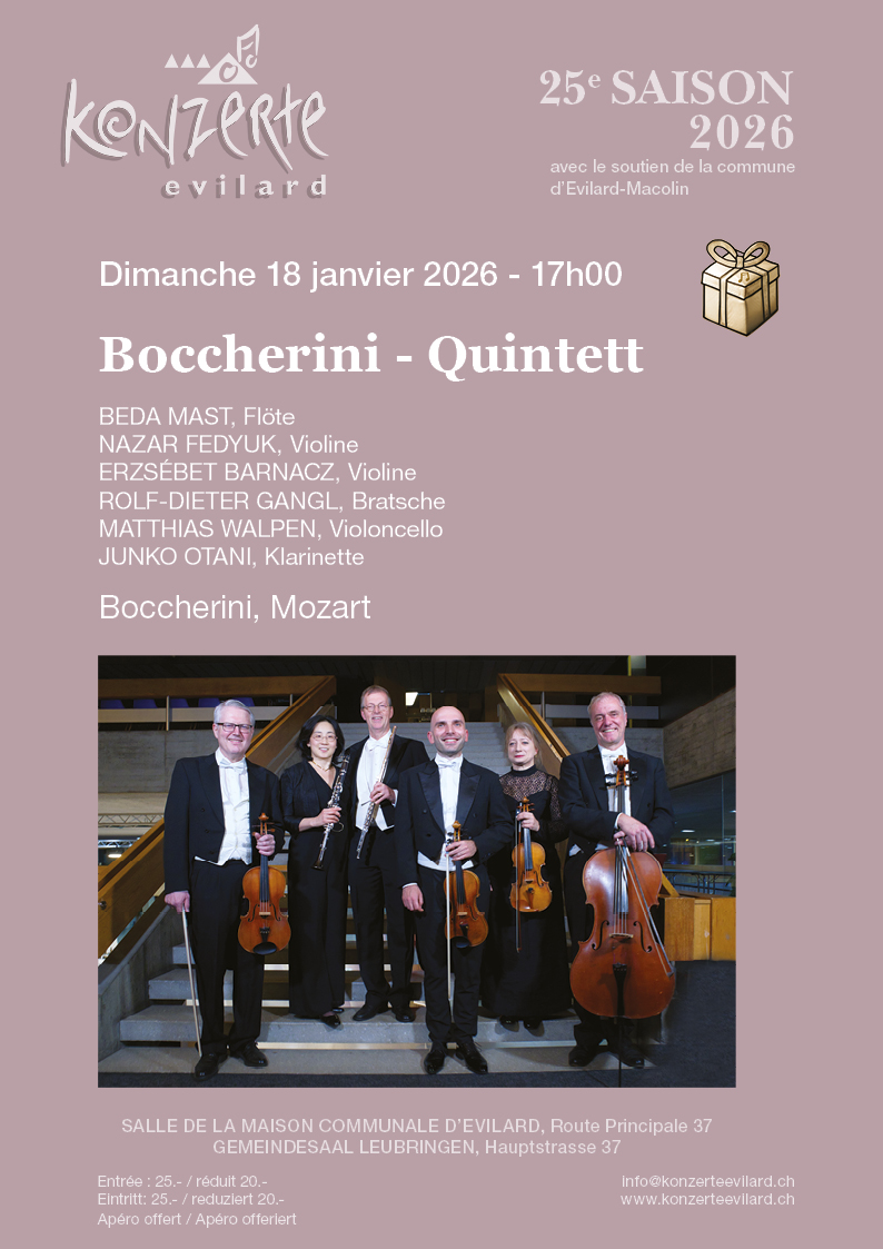 En 2026 konzerte evilard peut fêter ses 25 ans. En ouverture de notre saison de jubilé nous avons le grand plaisir d'accueillir le quintette Boccherini avec des œuvres de Boccherini et Mozart !